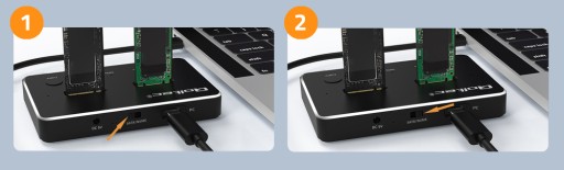 - Pierwszy poprzez umieszczenie dysku twardego M.2 SSD w porcie A lub B, podłączenie stacji do zasilania i komputera za pomocą kabla USB C 3.1.