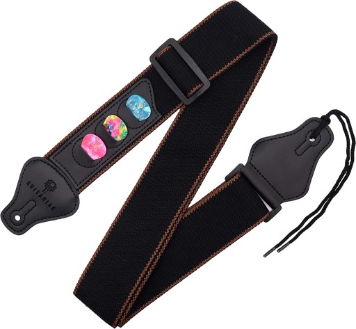 - 1 x wysokiej jakości, gruby i wygodny skórzany pasek do gitary z nowoczesnym żebrowanym brzegiem, który przechowuje kostki,