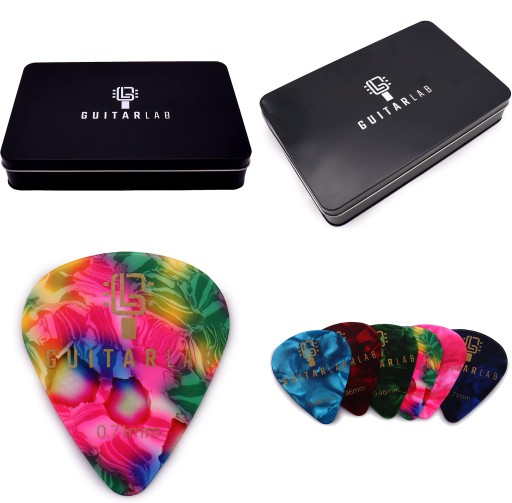 9 kostek znajduje się w woreczku sygnowanego marką Guitar Lab, który z łatwością można schować do kieszeni lub futerału gitarowego.