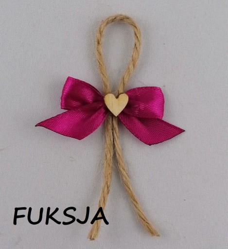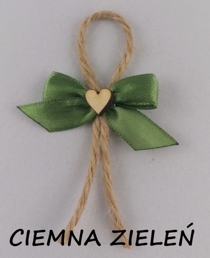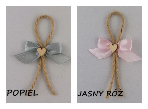 - Przypinka składa się z atlasowej kokardki doczepionej do jutowego sznurka i ozdobionej drewnianym serduszkiem