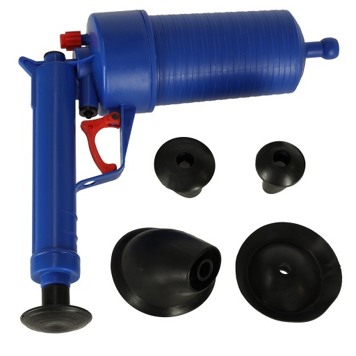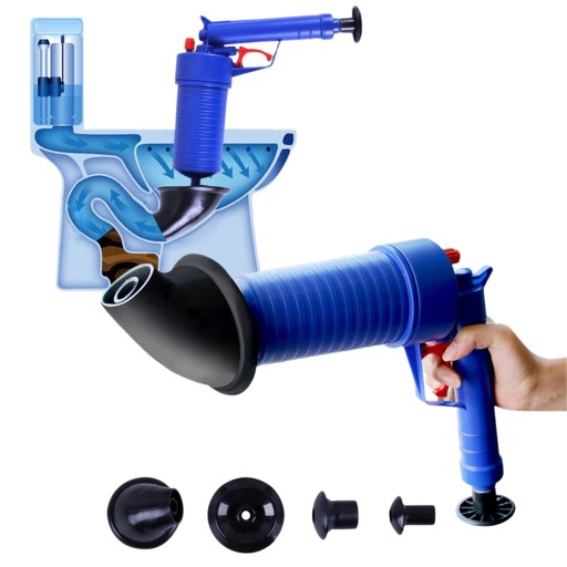 - Z czterema wymiennymi końcówkami, pistolet doskonale radzi sobie z problemami w odpływach w zlewie, toalecie, umywalce czy nawet w wannie.