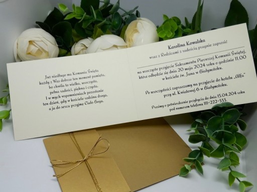ZK37*2 Zaproszenie komunijne ze złotym sznurkiem na Komunię PERSONALIZACJA