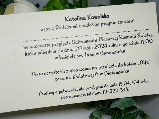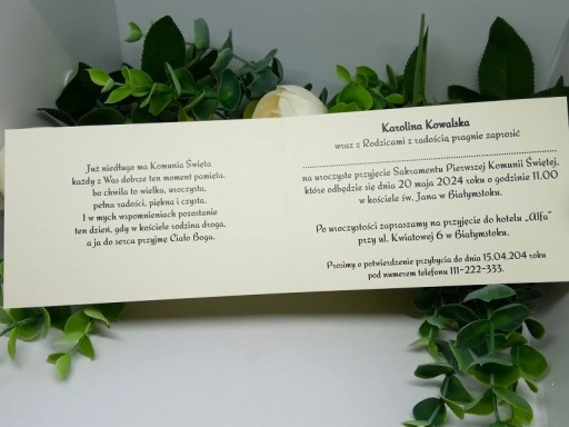 Podana cena obejmuje wpisanie danych osoby, która zaprasza, terminu i miejsca przyjęcia Sakramentu, miejsca przyjęcia komunijnego oraz terminu i nr telefonu do potwierdzenia przybycia. NIE OBEJMUJE WPISANIA DANYCH ZAPRASZANYCH GOŚCI. MIEJSCE NA WPISANIE DANYCH ZAPRASZANYCH GOŚCI POZOSTAWIAMY WYKROPKOWANE.