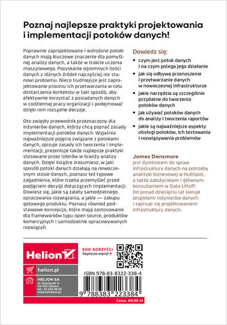 Poprawnie zaprojektowane i wdrożone potoki danych mają kluczowe znaczenie dla pomyślnej analizy danych, a także w trakcie uczenia maszynowego. Pozyskanie ogromnych ilości danych z różnych źródeł najczęściej nie stanowi problemu. Nieco trudniejsze jest zaprojektowanie procesu ich przetwarzania w celu dostarczenia kontekstu w taki sposób, aby efektywnie korzystać z posiadanych danych w codziennej pracy organizacji i podejmować dzięki nim rozsądne decyzje.Oto zwięzły przewodnik przeznaczony dla inżynierów danych, którzy chcą poznać zasady implementacji potoków danych. Wyjaśnia najważniejsze pojęcia związane z potokami danych, opisuje zasady ich tworzenia i implementacji, prezentuje także najlepsze praktyki stosowane przez liderów w branży analizy danych. Dzięki książce zrozumiesz, w jaki sposób potoki danych działają na nowoczesnym stosie danych, poznasz też typowe zagadnienia, które trzeba przemyśleć przed podjęciem decyzji dotyczących implementacji. Dowiesz się, jakie są zalety samodzielnego opracowania rozwiązania, a jakie - zakupu gotowego produktu. Poznasz również podstawowe koncepcje, które mają zastosowanie dla frameworków typu open source, produktów komercyjnych i samodzielnie opracowywanych rozwiązań.Dowiedz się: czym jest potok danych i na czym polega jego działanie jak się odbywa przenoszenie i przetwarzanie danych w nowoczesnej infrastrukturze jakie narzędzia są szczególnie przydatne do tworzenia potoków danych jak używać potoków danych do analizy i tworzenia raportów jakie są najważniejsze aspekty obsługi potoków, ich testowania i rozwiązywania problemówPoznaj najlepsze praktyki projektowania i implementacji potoków danych!