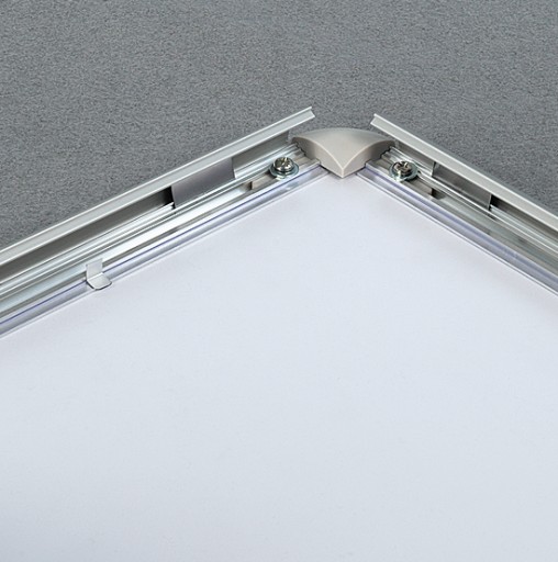 Tablica zatrzaskowa typu OWZ z profilu aluminiowego o szerokości 25 mm, wykończona plastikowymi zaokrąglonymi głowicami narożnymi. Rama dostępna w kolorze srebrnej anody. Produkt wyposażono w elastyczną folię antyrefleksyjną z filtrem UV o grubości 0,5 mm, która tłumi refleksy światła, chroniąc plakat przed blaknięciem. Tylna ściana wykonana z trwałego i odpornego na pęknięcia materiału. Do nadruku grafiki polecamy użycie papieru plakatowego 150 g.W zestawie: elementy mocujące.