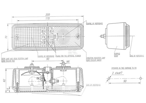 Lampa tylna zespolona marki WAŚ o napięciu 12/24 V, wymiarach 70 x 200 mm, rozstawie montażowym 90 mm i numerze katalogowym 1400681300, szeroko stosowana w maszynach i pojazdach wielu marek.
