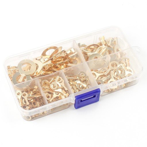 Końcówki kablowe do podłączenia kabli do urządzeń elektrycznych, innych przewodów, powierzchniami, itp. Zestaw plastikowy jest w pudełku, posegregowane rozmiarami.