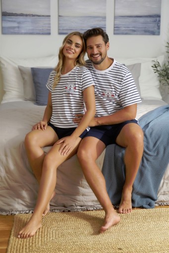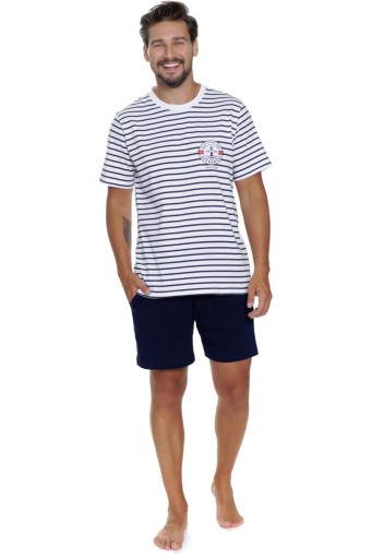 Piżama męska o marynarskim stylu, koszulka z krótkim rękawem w paski, na wysokości klatki piersiowej nadruk. Do kompletu jednolite krótkie spodenki z kieszeniami.