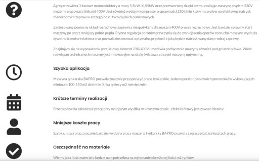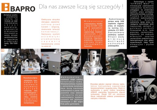 Mieszarko-pompa przeznaczona do ciągłej pracy w oparciu o fabrycznie suche gotowe mieszanki do zastosowania maszynowego, w szczególności różnorodne zaprawy tynkarskie na bazie gipsu, cementu i wapna. Aplikacja materiałów odbywa się w sposób automatyczny. Użycie agregatu tynkarskiego wraz z gotowymi fabrycznie suchymi zaprawami gwarantuje efektywny sposób tynkowania. Eliminowany jest proces nakładania tynku metodą ręczną na rzecz maszynowego. Przy użyciu agregatu tynkarskiego prace tynkarskie są wykonywane przy mniejszym wysiłku, w znacznie krótszym czasie i z lepszym efekt końcowym.