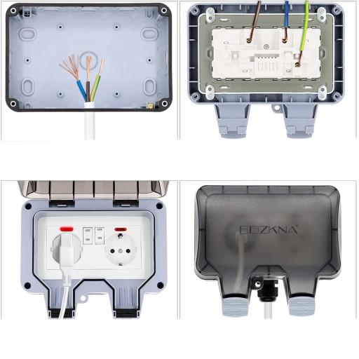 - Wielofunkcyjne gniazdko zewnętrzne Odporne na warunki atmosferyczne gniazda są używane na zewnątrz w pralniach, warsztatach, garażach, ogrodach, basenach i zastosowaniach komercyjnych. Stosowane również wewnątrz pomieszczeń w kuchni, pralni, łazience i piwnicy. Kompletne akcesoria: 8 wkrętów, 4 kołki rozporowe, 8 uszczelki gumowe (czarne/szare), 1 śrubokręt, 2 złącza