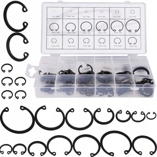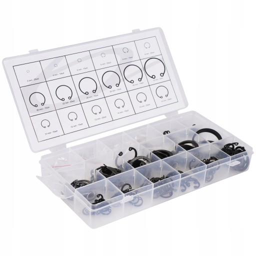 Komplet 300 wewnętrznych pierścieni Segera. Pierścienie trzymają dobrze, są wykonane z trwałej sprężystej stali. Różnorodność rozmiarów w zestawie daje pewność, że znajdziemy odpowiedni, potrzebny rozmiar. Zestaw znajduje zastosowanie w każdym profesjonalnym warsztacie.