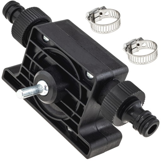 Pompa do przepompowania wody. Wałek napędowy pasuje do zacisku każdej wiertarki lub wkrętarki. Uniwersalne złącza pozwalają łatwo podłączyć węże ogrodowe wyposażone w szybkozłącza. Uniwersalne złącza pozwalają łatwo podłączyć węże ogrodowe wyposażone w szybkozłącza.