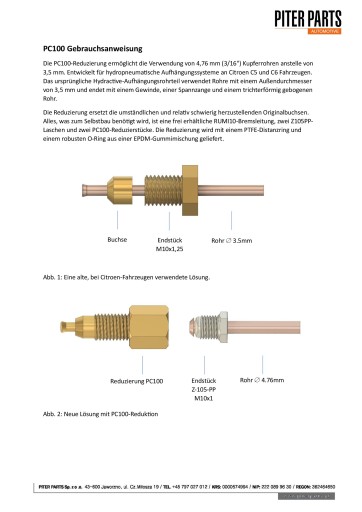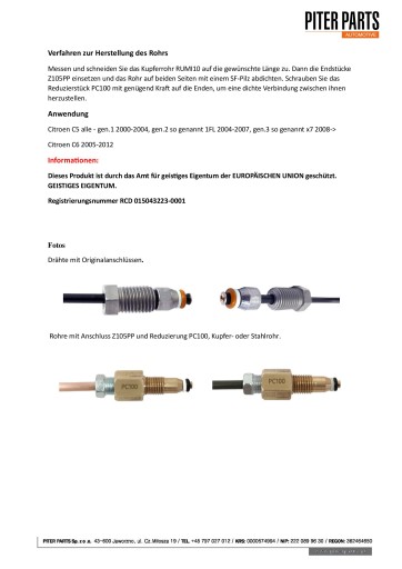 Do samodzielnego wykonania przewodu wystarczy rurka miedziana, dwie końcówki stalowe oraz dwie redukcje PC100. Do zakucia rurki miedzianej niezbędna jest standardowa maszynka do zarabiania przewodów hamulcowych z adapterem 4.76mm (3/16”) - dostępna na innej aukcji. Maszynka posiada instrukcję w języku polskim.