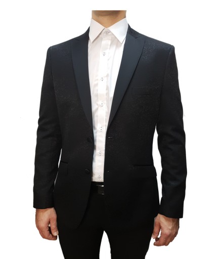 Niespotykany, niezwykle elegancki czarny garnitur z marynarką w stylu smokingowym. Marynarka posiada tłoczony, ornamentowy wzór, szalowy kołnierz z satyny, laminowane kieszenie oraz guziki powleczone satyną. Spodnie gładkie, zaprasowane w klasyczny kant świetnie wysmuklą męską sylwetkę.