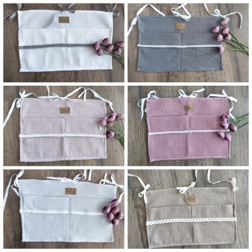 Zorganizuj przestrzeń wokół maluszka. Podczas przewijania dziecka ważne jest, aby mieć wszystko pod ręką. Gdy zaczyna się wiercić, sekunda nieuwagi i może spaść z dużej wysokości. Na przewijaku zbyt dużo miejsca nie ma, zwłaszcza jak nasz brzdąc podrośnie. Z pomocą przychodzą podręczne organizery zawieszane na łóżeczko. Nasze posiadają dwie spore przegródki. Wykonane są z grubej tkaniny bawełnianej typu wafelek. Ozdobione koronkami przez co są nie tylko praktyczne, ale i urocze. Różne kolory do wyboru. Z każdym naszym organizerem możesz skomponować piękny zestaw wyprawkowy (możesz dokupić min. rożek, kocyk, ręcznik, kokon niemowlęcy, poduszkę do karmienia, zawieszkę do smoczka, śliniaczek itp)