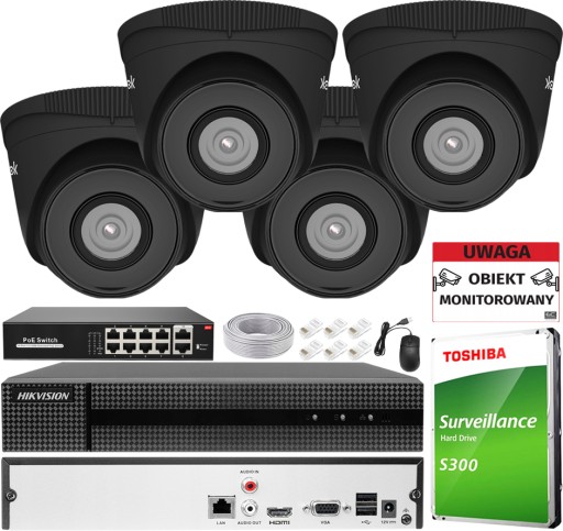 4 Kamery kopułkowe IP 5Mpx HiLook | 1x Rejestrator IP 8CH Hikvision | Switch 8 portów PoE | Dysk HDD 1TB | Akcesoria montażowe
