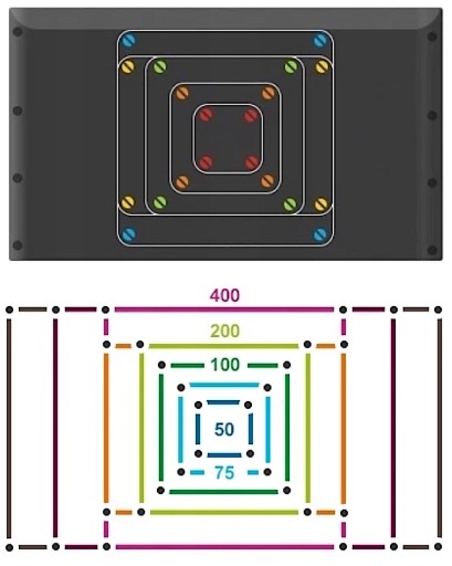 - VESA: 100x100, 100x200, 200x200, 300x300 ..... 600x400