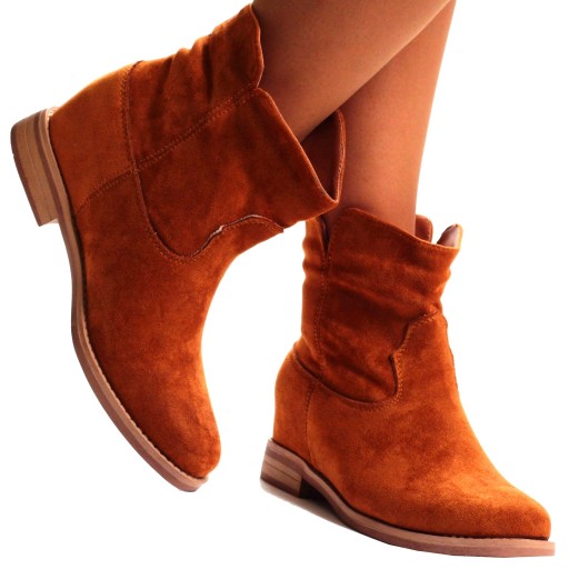Gładkie, zamszowe, damskie zamszowe botki w kolorze camel. Posiadają ukryty koturn oraz delikatne ocieplenie. Idealne na jesień lub wiosnę.