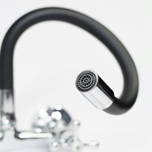Chromowana solidna bateria z giętką wylewką która zapamiętuje swój kształt. Wąż bez trudu utrzymuje ciężar nawet intensywnego strumienia.
