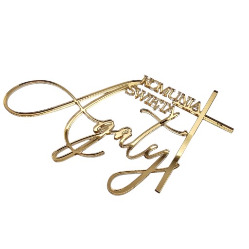 Dekoracja wyróżnia się starannym wykonaniem, prezentując imię dziecka i misternie wycięty krzyżyk z napisem "Komunia Święta". Materiał w postaci złotej lustrzanej plexi dodaje elementu szlachetności, nadając całej kompozycji wyjątkowy i elegancki charakter.
