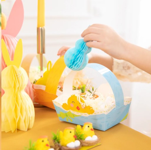 Zestaw 4 uroczych koszyczków wielkanocnych to niezwykła dekoracja, która wniesie radość i kolor do Twoich świątecznych przygotowań. Każdy z koszyczków został wykonany z solidnego papieru i ozdobiony uroczymi wzorami przedstawiającymi króliczki i kurczaczki, co nadaje im wyjątkowego charakteru.