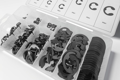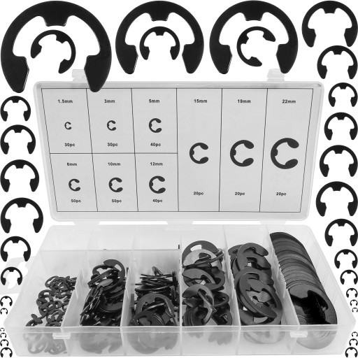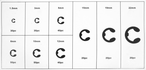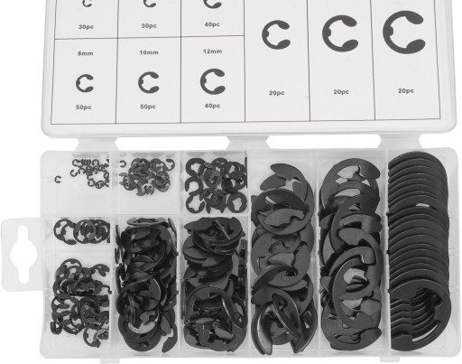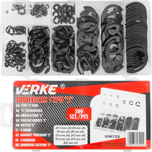 Zestaw składa się z 300 sztuk zawleczek typu E. Zawleczki umieszczone są w wygodnym opakowaniu typu "sortownik".