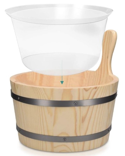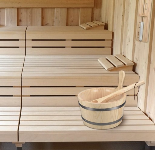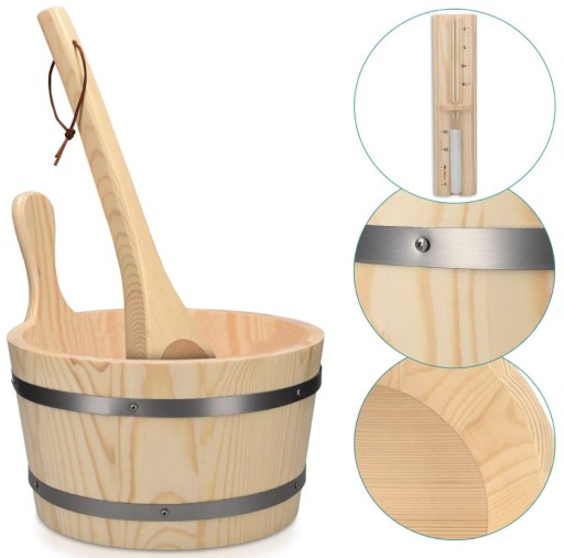 ⭐️Pięknie wykonane wiadro o pojemności 5L, chochla ułatwiająca dozowanie wody na gorące kamienie, oraz termometr, który pozwoli Ci monitorować temperaturę w saunie.