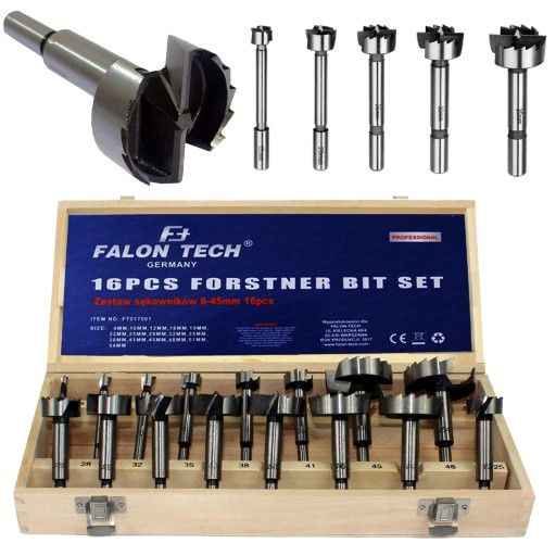 Zestaw profesjonalych frezów do drewna, przeznaczonych do wycinania otworów, usuwania sęków i kołków.
