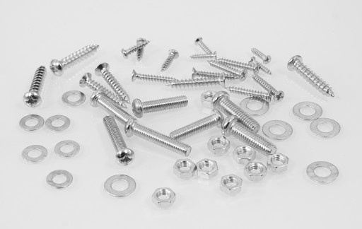 Zestaw 347 sztuk śrub oraz nakrętek. Całość zapakowana jest w plastikowe pudełko.