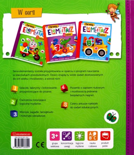 Seria elementarzy dla 3-latka, 4-latka i 5-latka została przygotowana w oparciu o aktualne programy nauczania w przedszkolu i tematycznie nawiązuje do następujących po sobie pór roku. Dziecko poznaje tu przyrodę i zachodzące w niej zmiany, uczy się podstawowych zasad higieny oraz poznaje otaczający je świat. Materiał ułożony jest od jesieni do lata, czyli pokrywa się z rokiem przedszkolnym. Dzieci trzyletnie rozpoczynają swoją przygodę z nauką w bardzo przyjazny sposób, czyli poprzez zabawę. Kolorują, łączą w pary pasujące do siebie elementy, poznają charakterystyczne zawody, uczą się nazywać zwierzęta i dopasowują je do określonych środowisk. Utrwalają wiedzę o najbliższym otoczeniu, poznają zasady zdrowego żywienia i higieny.