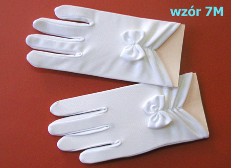 Efektowny dodatek do alby lub sukienki komunijnej dla dziewczynki - krótkie rękawiczki z palcami, przystrojone kokardką.
