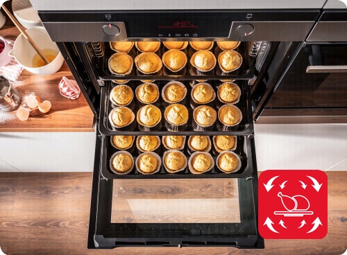 Nowa konstrukcja komory piekarnika Amica ED37515V gwarantuje idealną, równomierną dystrybucję ciepła w całym piekarniku. Dzięki temu możesz przygotować dużą porcję wypieków, mając pewność, że będą one równo zarumienione i wypieczone. W tym pojemnym piekarniku bez problemu zmieścisz ponad 100 muffinek jednocześnie! Możesz z łatwością suszyć grzyby i owoce oraz piec na kilku poziomach naraz.