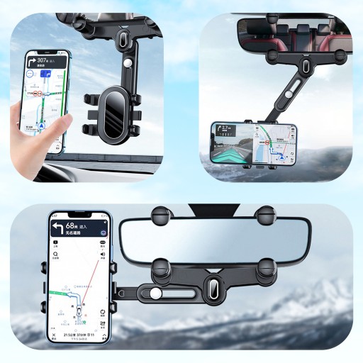 Wygodny i stabilny uchwyt na lusterko wsteczne samochodu, umożliwiający umieszczenie telefonu w dogodnym miejscu, które nie przeszkadza w obsłudze pojazdu.