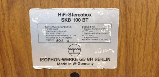Kolumny stereofoniczne niemieckiej produkcji Isophon-Werke GMBH Berlin SKB 100 BT. Konstrukcja 3 drożna z bass-reflex z przodu. Graja wyśmienicie nie jedene wspułczesne kolumny nie odtworzą dźwięku tak ja te. Głośniki niskotonowe na zawieszeniu z gumy, przez to nie ma co się martwic o regenerację. Posłużą jeszcze kolejne tyle co maja lat. Technicznie w pełni sprawne wszystke głośniki sprawne. Grają równo i czysto. Jeden głośnik średnio tonowy miał lekko uszkodzoną obwódke, została dobrze podklejona klejem. Wizualny stan skrzyń oceniam na dobry, ze względu na to ze dwa narożniki były lekko obitę. uzupełniłem ubytki szpachla i jak widać na załączonych zdjęciach jest to trochę widoczne. Jedna kolumna lewy górny narożnik z przodu. Druga kolumna prawy dolny narożnik tył. Brak maskownic. Przewody zakończone wtykiem typy 2 Din. Jest to dość rzadko spotykany model na rynków wtórnym. Ja za nimi polowałem jakieś 2 lata. Przyszedł czas na rozstanie się. Moc nominalna 70 Watt. Moc muzyczna 100 Watt. Rezystancja 4 Ohm. Pasmo przenoszenia 35-20 000 Hz. Wys.47xSzer.26xGłęb.19,5.