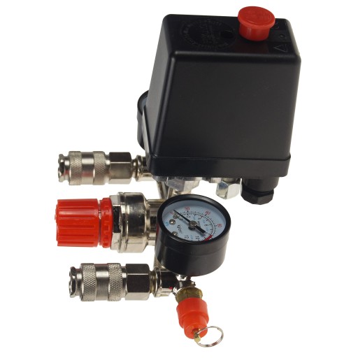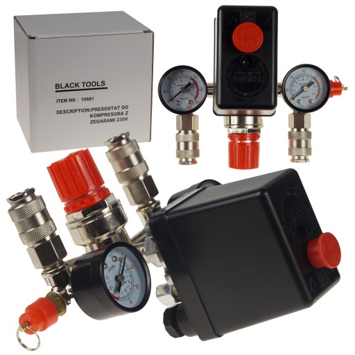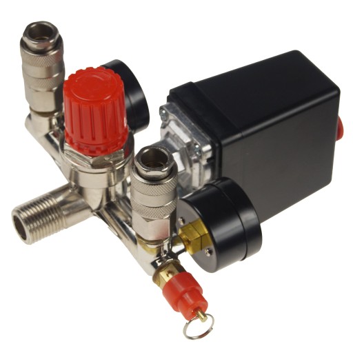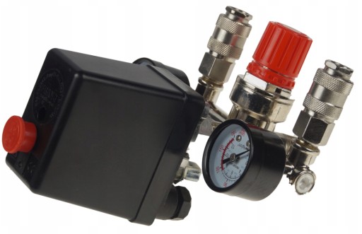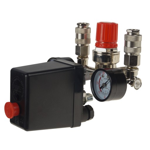 Wysokiej jakości wyłącznik ciśnieniowy (presostat) z kolektorem, dwoma szybko złączkami i manometrami przeznaczony do kompresorów ciśnieniowych na 230V.