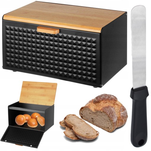 - Chlebak stalowy w kolorze czarnym z drewnianą pokrywą