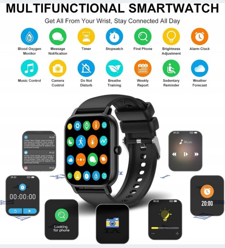 - Przypomnienie o wiadomości: Po połączeniu się z Bluetoothem wszystkie wiadomości i powiadomienia będą wyświetlane na Twoim nadgarstku i będą przypominać Ci poprzez wibracje. Możesz je włączyć lub wyłączyć w ustawieniach. Nigdy nie przegapisz żadnych wiadomości podczas spotkań, treningu i jazdy. Ten zegarek jest kompatybilny z systemami Android 5.0, iOS 9.0, Bluetooth 4.0 i nowszymi.