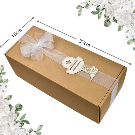 - pudełko, karbowany eco kartonik wypełniony wełną drzewną, wymiary: 37x16x12,5 cm z emblematem przewiązanym tasiemką