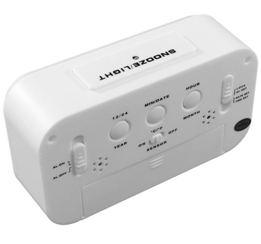 - Zegar posiada termometr wskazujący temperaturę w skali Celsjusza lub Fahrenheita (wyboru jednostki dokonuje się suwakiem SENSOR z tyłu urządzenia)