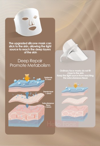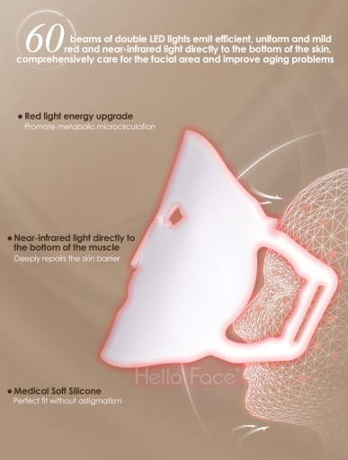 60 wiązek podwójna dioda LED świateł emituje wydajną, jednolitą i łagodną czerwień i prawie światło podczerwone bezpośrednio na dno skóry, kompleksowo pielęgnując okolice twarzy i poprawiając problemy ze starzeniem się