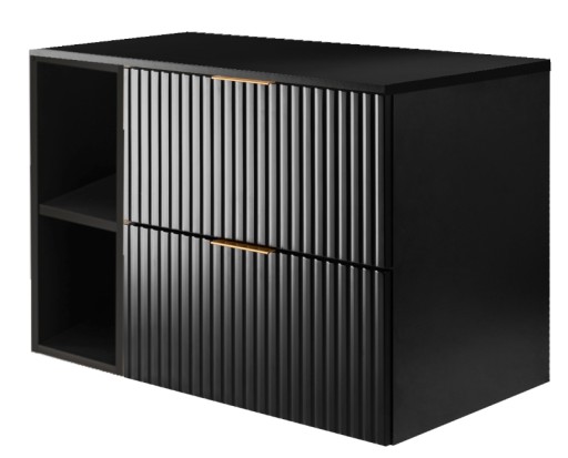 Czarna elegancka wisząca szafka łazienkowa Flow 80 cm z blatem i czarnym regałem