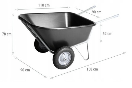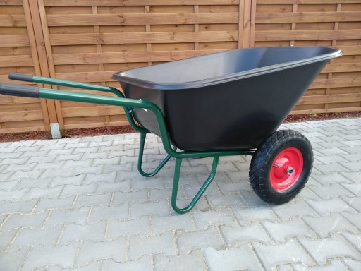- Praktyczna taczka dwukołowa została wykonana z wytrzymałego tworzywa co daje możliwość załadunku do 300L.