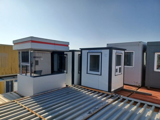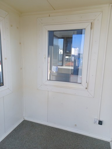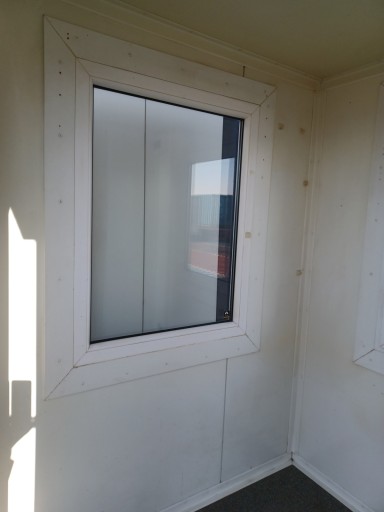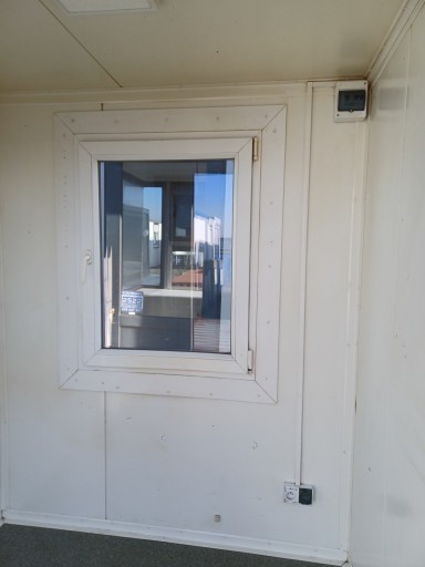 Kontener – stróżówka lub małe biuro. Wykonana kompleta instalacja elektryczna, dużo przeszkleń bez rolet zewnętrznych.
