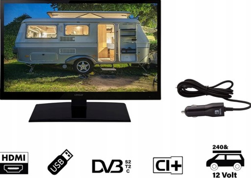 - Telewizor kempingowy oferuje wiele połączeń, a zasilacz samochodowy 12 V ma idealny rozmiar do podróży.