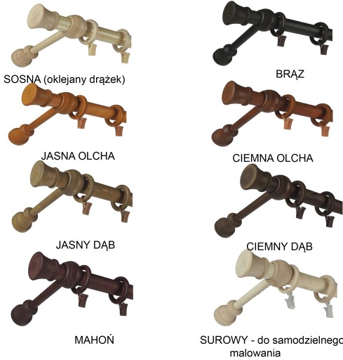 Są malowane bejcą wodną i woskowane. Z wyjątkiem koloru sosna - drążki są oklejane termokurczliwą folią pcv z nadrukiem drewna