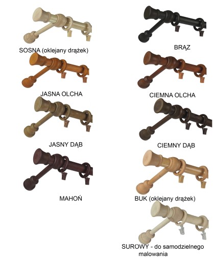 *Kolor sosna oraz buk składają się z drążków oklejonych termokurczliwą folią, pozostałe kolory są malowane bejcą wodną.