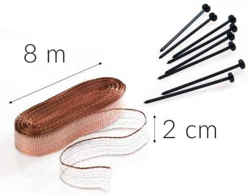 Produkt składa się z dwóch taśm – siatek o długości 8 m każda oraz 16 kołków. Paliki i ogrodzenie można dostosować do formy i potrzeb ogródka, a ich montaż jest banalnie łatwy i szybki – wystarczy wbić kołki w ziemię i rozciągnąć siatkę wokół nich. Wystarczy taki mały gadżet, aby ochronić swoje owoce i warzywa, takie jak truskawki czy rzodkiewki przed żarłocznymi ślimakami. Płotek przy tym nie rzuca się w oczy, dzięki miedzianej barwie siatki i niedużej wysokości – zaledwie 2 cm. Taka wysokość jest w pełni wystarczająca i skutecznie ochroni uprawy.