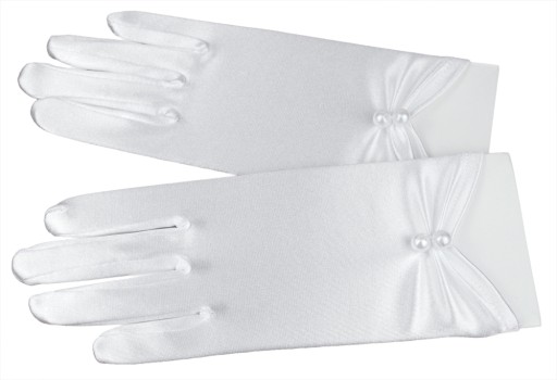 Stylowy dodatek do alby lub sukienki komunijnej dla dziewczynki - krótkie rękawiczki z palcami, wykończone ozdobnym marszczeniem z perłami.