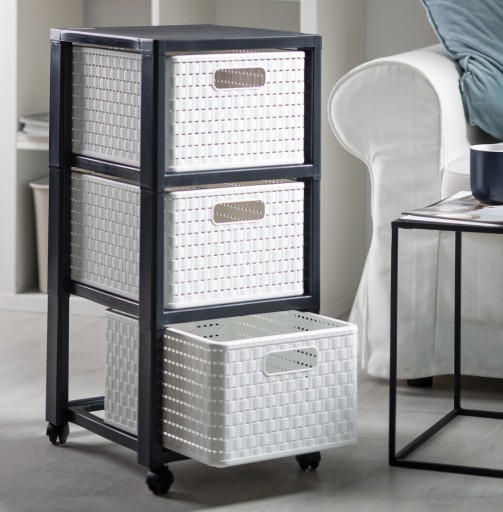 Regał COUNTRY ma elegancki wygląd rattanu. Jest dostępny w wielu kolorach i pasuje do różnych stylów wyposażenia. Kosze w formacie A4 zapewniają wygodne i schludne miejsce do przechowywania. Jednocześnie regał Country jest kompatybilny ze wszystkimi koszami A4 COUNTRY. Każde pudełko z rattanu można łatwo myć w zmywarce. Dzięki szerokości 325 mm, głębokości 375 mm i wysokości 712 mm regał na kółkach pasuje do każdego pomieszczenia. Dzięki czterem obrotowym podwójnym kółkom wieżę z szufladami można elastycznie używać. Regał COUNTRY jest solidny i trwały.
