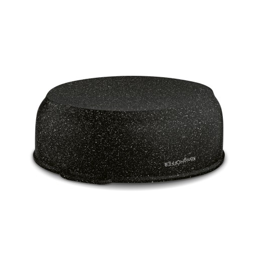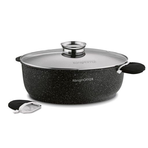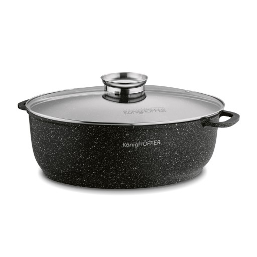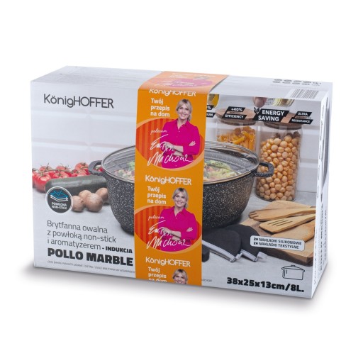 Owalna brytfanna Konighoffer Pollo (pojemność 8 l) zapewni ci wysoki poziom komfortu podczas gotowania. Ochroni składniki przed przypaleniem oraz przywieraniem. Równomiernie i szybko się rozgrzeje. Pozwoli na efektywne duszenie pod przykryciem i śledzenie na bieżąco procesu przygotowywania posiłku. Zyskujesz wieloletnią trwałość dzięki korpusowi z odlewu aluminiowego die cast i powłoce marmurowej PFOA Free typu stone o odporności na wiele cykli ścierania. To opcja dla każdego, kto ceni sobie zdrową i pełnowartościową dietę, np. przygotowaną na minimalnej ilości tłuszczu. Bezproblemowa pielęgnacja i długa żywotność naczynia stylizowanego na marmurowe to inne podstawowe korzyści z zakupu tego modelu brytfanny imitującej wzór granitu. Masz możliwość użytkowania jej na wszystkich typach kuchenek. Produkt sprzedawany jest w zestawie ze szklaną pokrywką wyposażoną w aromatyzer. Do zestawu dołączono 2 nakładki silikonowe i 2 tekstylne na rączki naczynia. Można używać jej w piekarniku w max. 220 st. C, ale bez pokrywy. Produkt ma rekomendację Ewy Wachowicz. Jako ambasadorka marki Konighoffer, gorąco i z uśmiechem poleca go ona do domowego użytku. Razem z nim zdobędziesz twój przepis na dom. To jedna z najlepszych opcji w tej kategorii! Odlewane uchwyty są integralną częścią korpusu naczynia. W związku z tym, że nie posiadają żadnych dodatkowych łączeń, nagrzewają się razem z brytfanną. Sprawia to, że podczas przenoszenia i zdejmowania z kuchenki oraz wyjmowania z piekarnika niezbędne jest stosowanie nakładek ochronnych (materiałowych, silikonowych) lub rękawic kuchennych, aby uniknąć oparzenia dłoni. Rolą dołączonych nakładek silikonowych/materiałowych jest optymalna ochrona dłoni użytkownika przed oparzeniem. W przypadku prezentowanego naczynia są one elementem koniecznym do zdjęcia brytfanny z kuchenki, przenoszenia lub wyjęcia modelu z piekarnika. Oprócz zapewnienia pewnego chwytu izolują ciepło od skóry. Naturalnym jest, że część ciepła będzie odczuwalna. Jego poziom zostanie jednak utrzymany na bezpiecznym poziomie.